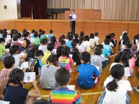 7月19日、第1学期終業式を実施しました。うれしいことにこの日は、今年度10日目の全校生がそろった日となりました。校長先生のお話のあとには、2年生と5年生の代表児童2名が、1学期にがんばったことについて書いた作文を発表しました。また終業式のあとには、6年生が9月の発表会に向けて練習してきた合唱曲の発表がありました。とてもきれいな歌声を披露してくれました。いよいよ夏休みがスタートします。充実した夏休みになりますよう、ご協力よろしくお願いします。