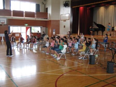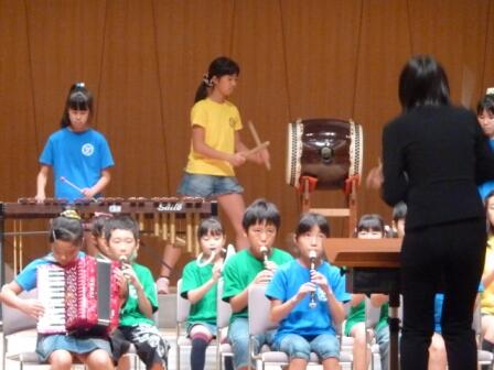 7月23日の学校の様子です。朝は学童に通っている子どもたちが、元気にラジオ体操をしていました。また、体育館では、音楽部の子どもたちが、一生懸命に合奏曲の練習に励んでいました。プールでは、五十畑・曲ヶ島・和泉の子どもたち約80名が、プール活動を楽しんでいました。夏休みに入りましたが、学校では元気な子どもたちの活動が続いています。