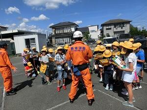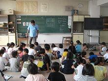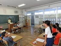 下校前に6年生に囲まれ、別れを惜しみながらあいさつ。