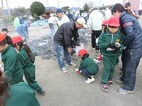 100名程のお年寄りの皆さんが学校に来てくださり、子どもたちと共にサツマイモを火床に入れてから、1・2年生とおじいちゃん・おばあちゃんの連合チーム8チームで、輪投げや玉入れを行いました。 おじいちゃん、おばあちゃんが、1・2年生に投げ方のコツを教えてくださったり、励ましの声かけをしてくださったり、子どもたちがお年寄りのプレーに拍手を送ったりと楽しい時間を過ごすことができました。また、ゲームの後は、焼きたてのお芋をみんなで一緒に食べました。