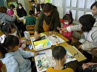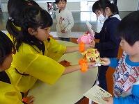 開会式でゲームの方法を説明した後、プレールームや2年生の教室で、魚釣りコーナーやふくろロケット、とことこ動物、ヨットカーなど、2年生が作ったおもちゃで遊ぶコーナーに、班ごとに別れた1年生が移動して、楽しく遊んでいました。
