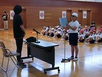 下校前に6年生に囲まれ、別れを惜しみながらあいさつ。