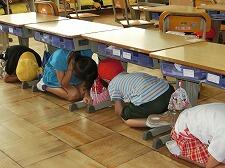 緊急放送後、担任の指示により、帽子をかぶり、机の下にもぐる子供たち。