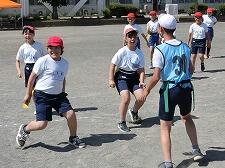 27日(月)、6年生が1年生のシャトルランの手伝いをしました。