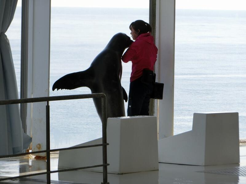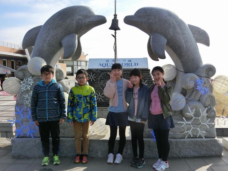 アクアワールド前で全員集合! アシカやイルカのショーに大興奮!