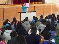 始めに子ども達と「努力・協力・チャレンジの2学期」を振り返りました。大きな行事がたくさんありましたが、その一つ一つを節目として、子どもたちはたくましく成長することができました。その後、3年生と6年生代表児童より、めあてを持って取り組んだ習字や縄跳び、頑張った持久走大会での達成感などについての作文発表がありました。終業式の後は、児童指導の先生による冬休みの生活についてのお話がありました。