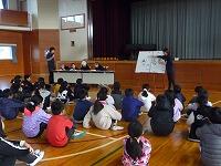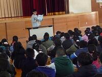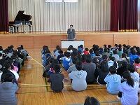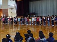 始めに子ども達と「努力・協力・チャレンジの2学期」を振り返りました。大きな行事がたくさんありましたが、その一つ一つを節目として、子どもたちはたくましく成長することができました。その後、3年生と6年生代表児童より、めあてを持って取り組んだ習字や縄跳び、頑張った持久走大会での達成感などについての作文発表がありました。終業式の後は、児童指導の先生による冬休みの生活についてのお話がありました。