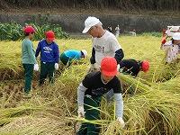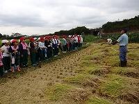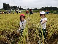 9月10日(月)、待望の稲刈りをしました。子どもたちは、のこぎり鎌で稲を刈るときの感触を楽しみながら、最後まで一生懸命作業に取り組みました。また、永島さんからは、お米作りの苦労話など教えていただき、子どもたちは、お米の大切さを改めて実感していました。みんなで作ったお米で、おにぎりを作るのが楽しみです。