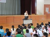 子どもたちは、校長先生のお話を聞きながら、1学期にがんばったことやできるようになったことを振り返りました。また、充実した夏休みを過ごすために、「自分の目標を目指して積極的にチャレンジすること・事故や病気に注意して、規則正しい生活をすること」というお話がありました。その後、2年生と5年生の代表児童が1学期を振り返っての作文発表をしました。最後に、6年生のピアノ伴奏に合わせて校歌を元気に歌いました。式終了後は、児童指導担当から夏休みの生活についての約束事の確認がありました。