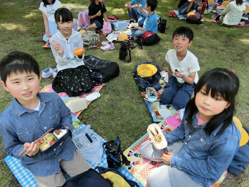 遊水地運動公園で昼食 美しい新緑とさわやかな風の中・・・ グループごとに「いただきます!」