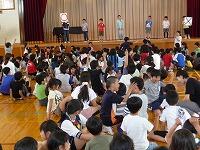 ふるさとを離れ都に出てきた杜子春は、仙人と出会いお金持ちになるが、執事にだまされ一文無しになる。そんな時、再び仙人と出会い、お金はいらないから弟子にしてほしいと申し出て、仙人の住んでいる山で怖くて辛い試練を受ける中、母親の無償の愛情を知り、人間として一番尊い生き方に気づくという内容でした。子どもたちは、生の劇を楽しみながら、いろいろなことを考え、親子の愛情や人を思うやさしさなどお金では買えないものがあること等、様々な気付きがあったことと思います。劇団め組の皆様、素晴らしい劇をありがとうございました。