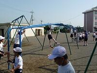 第1回目ということで、運動委員会による説明の後、全学年一斉にスタートしました。 ケンケンパ、スキップ、タイヤ跳び、ジグザグ走り、ジャングルジム、平均台、ろくぼく、鉄棒逆上がり、登り棒、うんてい などといろいろな種目があり、さまざまな運動能力を楽しみながら育むことができます。