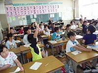ALT ・ ロバート先生による外国語活動の授業では、1・3・4年生が、英語を用いた話す・聞くの言語活動・コミュニケーション練習や音楽に合わせジェスチャーをまじえての英語に親しむ活動などを楽しんでいました。また、花壇の前では、2年生が、ミニトマトやピーマンなどの野菜の苗を各自の鉢に植え替える作業を行いました。校庭では、2時間目、3年生が体育でリレーの練習を行いました。4時間目6年生は校舎などの写生を行いました。5年生は、教室で真剣に道徳の授業を行いました。