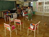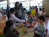 開会式でゲームの方法を説明した後、プレールームや2年生の教室で、魚釣りコーナーやふくろロケット、コロコロコロン、ボウリング屋さん、パッチンガエル、ぴょんうさぎ など、2年生が作ったおもちゃで遊ぶコーナーに、班ごとに別れた1年生が移動して、楽しく遊んでいました。