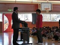 始めに、感謝の気持ちを込めて「レッツゴーソーレー」を笛で演奏しました。続いて、「ビリーブ」の歌のプレゼントをしました。その後、3年2組の子ども達が、一人一人橋本先生との思い出や感謝の言葉を発表しました。最後に、橋本先生から、静小の感想や3年生との思い出などのお話をしていただいた後、全員で感謝の挨拶をしました。