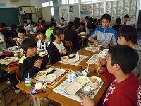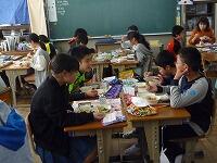 始めに大竹先生から、主食・主菜・副菜や栄養バランス、味のバランスなど、献立づくりのポイントについて説明していただきました。その後、6年生は、自分たちの好みや季節の食材、栄養バランスなどを意識しながら、各自の食べたいメニューづくりをしました。友達と話し合ったり、大竹先生に質問したりしながらの楽しい授業となりました。また授業の後には、大竹先生や担任の髙橋先生にもグループに入っていただき、作成したメニューや好きな給食のおかずなどの話をしながら、和気あいあいと給食を食べました。