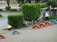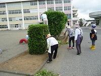朝8時、20名の皆様が学校に集まってくださり、作業を開始すると、校庭南側フェンス周辺の樹木や校庭東側、駐車場付近の植え込みの樹木や下草が、見る見るうちにきれいになりました。