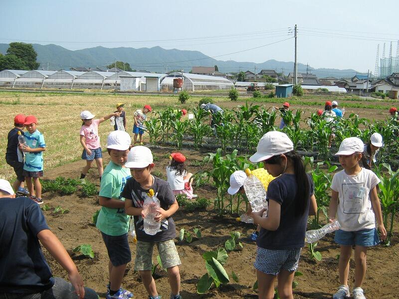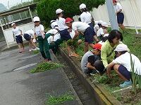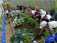 野菜の世話に来た2年生は、生き生きと生長している野菜と、傍らに積まれた大きな草の山を見て、「ありがとうございます。」と感謝の気持ちを伝えました。ペットボトルに入れてきた水を野菜の根元にあげながら、落花生が黄色くて可愛らしい花を咲かせていることにも気づきました。さといも・トウモロコシ・落花生・枝豆・サツマイモの苗が、暑さに負けずに大きく育ち、収穫を迎えるまで、水やりや除草の世話を続けていきます。