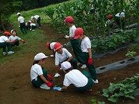 ふれあい館の皆さんと交流しながら野菜を育てている子どもたちは、心も豊かに育てています。