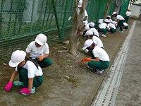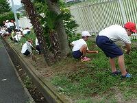 校庭南側のフェンス沿いから西側の外トイレ周辺、体育館周辺、校舎北側のフェンス沿い、そして、お借りしています学校西側の1 ・ 2年生の畑など、学年ごとの分担場所の除草を一生懸命行いました。子どもたちの頑張りにより、校庭や体育館周辺は、とてもきれいになりました。