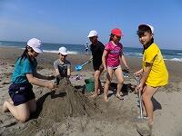 初夏を思わせるような晴天の中、一日目午後は、砂浜活動を行いました。班対抗で海水くみリレーや砂の造形づくりを行いました。みんなで波打ち際で遊んだり、協力して砂の造形を行ったりと、とても楽しい時間となりました。夜は、岩舟地区の各小学校の5年生と交流活動を行いました。