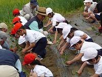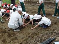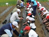 1年生は、さつまいもの苗を植えました。2年生は、えだまめ、トウモロコシ、落花生、さといもの4種類の野菜の苗と種をまきました。また、2年生は、学校に戻り、なす、ミニトマト、ピーマン、オクラの苗を自分の鉢に植え替える作業もしました。 さつまいもやえだまめ、なす、ミニトマトなどの苗に初めてさわった子どもたちも多く、貴重な体験活動を楽しんでいました。