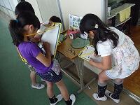 3-2 理科・キャベツに付いた、チョウの卵や幼虫の観察 観察カードに熱心にまとめる