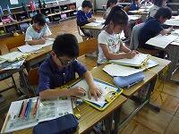 3時間目、3年2組では、理科の授業「チョウを育てよう」という単元で、キャベツに付いていた「もんしろチョウの卵や幼虫」の観察を行っていました。子どもたちは、興味を持って意欲的に観察し、観察カードに絵を描きながら、気づいたことを一生懸命まとめることができました。