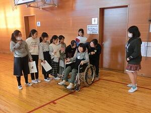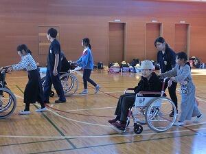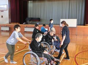 「車椅子体験」では、施設の利用者の方を乗せて押す体験をさせていただきました。