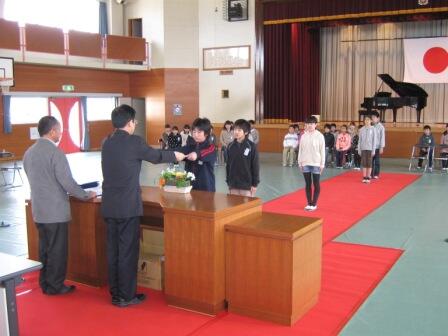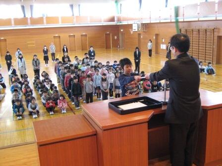 3月24日、平成25年度の修了式を実施しました。1~5年生の代表児童が、校長先生から「修了証」を受け取りました。いよいよ明日から春休みです。健康・安全に気をつけ、充実した春休みにしましょう。
