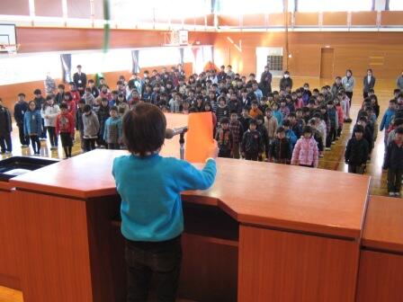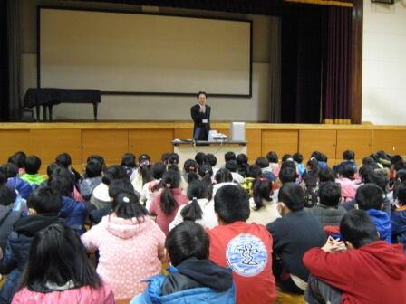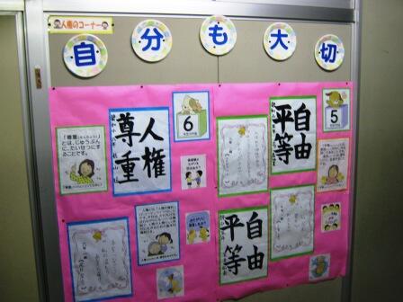 12月2日~6日まで、校内人権週間を実施しました。期間中は、人権尊重に関わる作品の掲示や、人権作文の朗読、人権集会など、様々な取り組みを行いました。6日には、上学年・下学年に分かれて、人権に関するビデオの鑑賞会も実施しました。ご家庭でも、学校の生活目標にあるような事柄について、話題にしてみてはいかがでしょうか。