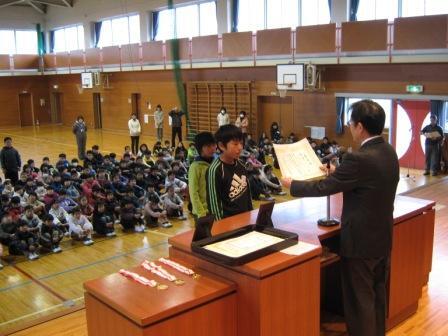 12月10日、表彰朝会を行いました。サッカー大会、書道展、ポスター展、町理科展、持久走大会などで活躍した子どもたちが表彰されました。朝会では、代表の子どもたちが賞状をいただきました。総勢128名が賞状を手にし、うれしそうな笑顔や満足した様子が見られました。おめでとうございます。今後もみなさんの活躍を期待しています。