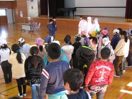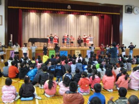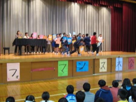 12月19日、第2回目のパフォーマンス大会を実施しました。今日は3年生1組、4年生1組、6年生(全員)の3組が、練習してきたパフォーマンスを披露してくれました。間には昨日同様、企画委員会と有志の子どもたち、そして先生方によるダンスもありました。観覧していた子どもたちも、大変盛り上がっていました。企画運営をがんばった企画委員のみなさん、ありがとうございました。