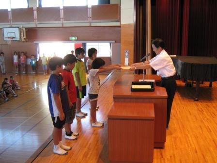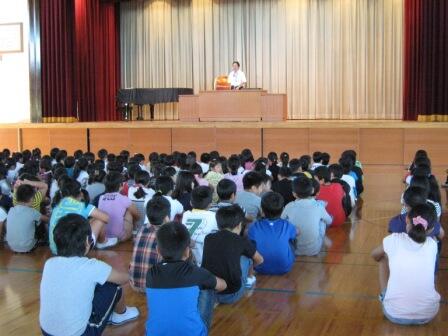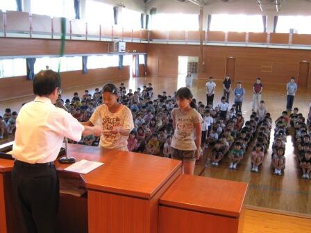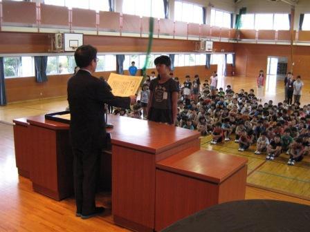 9月17日、朝会がありました。まずは、水泳大会やバレーボールの大会で活躍した子供たちの表彰がありました。その後は、校長先生から「東京オリンピック」や来週末に控えた運動会についてのお話がありました。子供たちは、大変よい態度で朝会に参加していました。