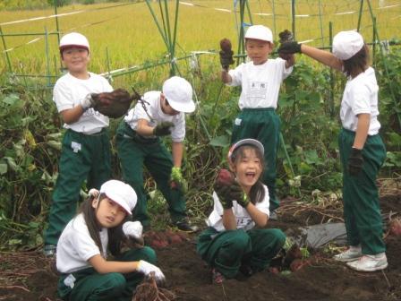 10月15日、1年生は畑に植えてあったさつまいもの収穫をしました。大きなおいもがたくさんとれました。とっても楽しく収穫できました。とれたおいもは、収穫祭で焼きいもにしていただく予定です。楽しみですね。