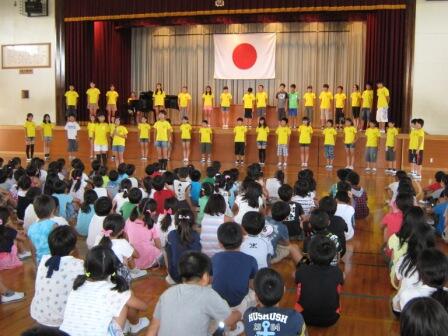 7月19日、第1学期終業式を実施しました。うれしいことにこの日は、今年度10日目の全校生がそろった日となりました。校長先生のお話のあとには、2年生と5年生の代表児童2名が、1学期にがんばったことについて書いた作文を発表しました。また終業式のあとには、6年生が9月の発表会に向けて練習してきた合唱曲の発表がありました。とてもきれいな歌声を披露してくれました。いよいよ夏休みがスタートします。充実した夏休みになりますよう、ご協力よろしくお願いします。