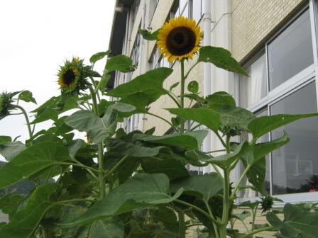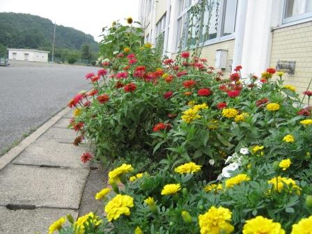 8月1日、校舎前にある花壇の様子を紹介します。東昇降口から西昇降口にかけて設置してある花壇には、様々な植物が、夏の太陽を浴びて元気に育っています。1年生の花壇では、ひまわりが大輪の花を咲かせていました。4年生の花壇では、ヒョウタンがなっていました。個別学級の花壇には、おいしそうなミニトマトがたくさんなっていました。学校においでの際には、ぜひご覧ください。
