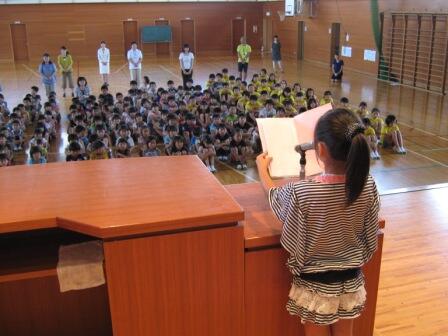 7月19日、第1学期終業式を実施しました。うれしいことにこの日は、今年度10日目の全校生がそろった日となりました。校長先生のお話のあとには、2年生と5年生の代表児童2名が、1学期にがんばったことについて書いた作文を発表しました。また終業式のあとには、6年生が9月の発表会に向けて練習してきた合唱曲の発表がありました。とてもきれいな歌声を披露してくれました。いよいよ夏休みがスタートします。充実した夏休みになりますよう、ご協力よろしくお願いします。