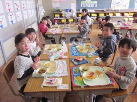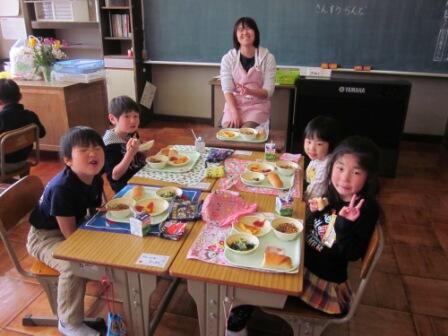 4月15日、1年生は初めての給食を教室で食べました。小学校での給食の配膳の仕方や、食べるときのマナーなどを、初めて学びました。グループで食べる給食は、とってもおいしそうでした。