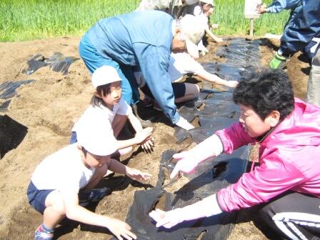 5月7日、1・2年生はふれあい館のおじいさんおばあさんたちに先生になっていただき、野菜の苗植えに挑戦しました。おじいさんおばあさんたちの注意を聞きながら、みんな一生懸命に苗植えをしました。