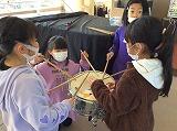 理科の時間では、「音のせいしつ」を学習しています。トライアングルや小太鼓をたたいてみて、ものが震える様子を手で触って感じ取っていました。