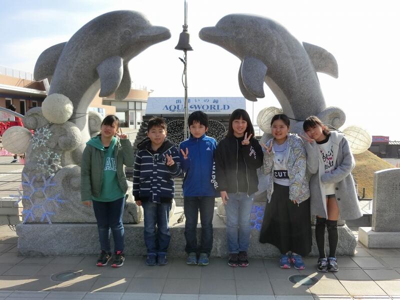 アクアワールド前で全員集合! アシカやイルカのショーに大興奮!