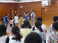 1年生・台の上で自己紹介 静小・マルバツゲームで盛り上がる 名刺交換ゲームでさらに仲良しに
