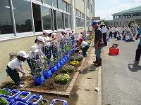 植替え作業の説明を聞く2年生 苗の植え方を教えていただく 鉢植え作業を終えて