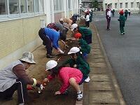 1年生、更生保護女性会の皆様と楽しくチューリップの球根を植える!