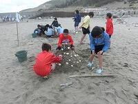 一日目午後は、砂浜で砂の造形を行いました。みんなで波打ち際で遊んだり、協力して砂の造形を行ったりと、とても楽しい時間となりました。夜は、岩舟地区の各小学校の5年生と交流活動を行いました。