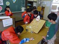 開会式でゲームの方法を説明した後、プレールームや2年生の教室で、魚釣りコーナーやふくろロケット、とことこ動物、ヨットカーなど、2年生が作ったおもちゃで遊ぶコーナーに、班ごとに別れた1年生が移動して、楽しく遊んでいました。