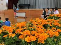贈呈式には、各学級の代表児童と環境委員会の児童が参加し、人権擁護委員の方々からマリーゴールドと日々草の鉢花を150鉢 いただきました。代表児童の挨拶では、「静小のみんなが優しい心を持ち、笑顔が増えていくように、人権の花を育てていきたい。」 という話がありました。