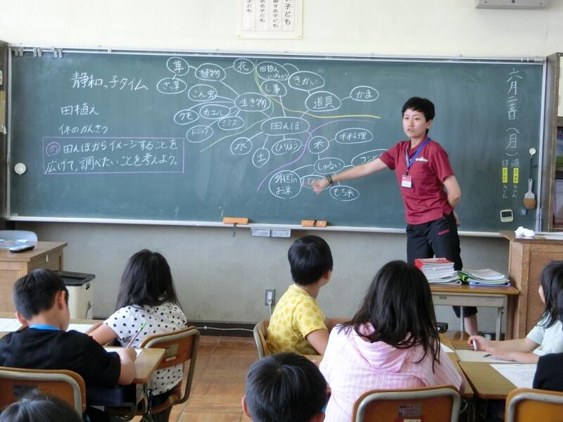 「田んぼ大好き3年生」の学習では、3年生全員で田植えを行い、田んぼの観察を続けています。これまでの活動で学んだことや感じたことをもとに、田んぼに関するイメージを膨らませ、調べ学習のテーマを考えることをねらいとした授業でした。