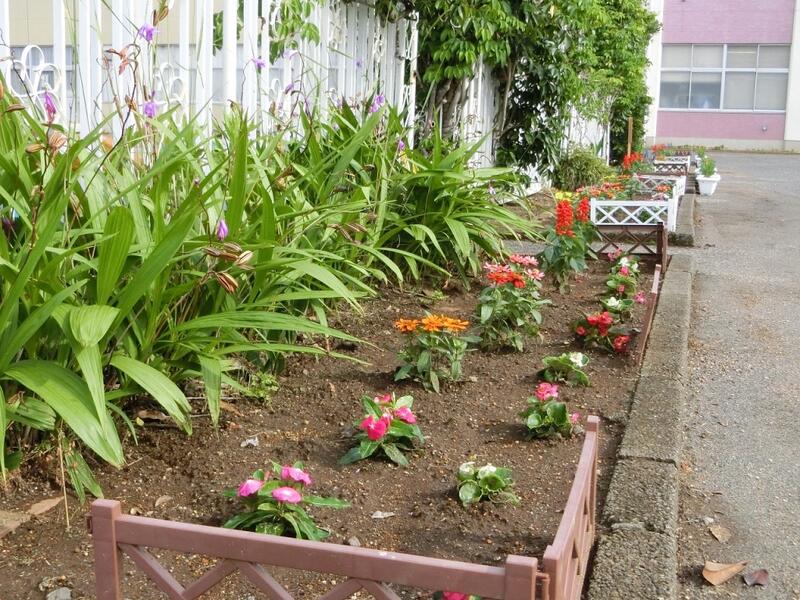 マリーゴールド、日々草、ベゴニア、サルビア、ジニアの色とりどりの花で学校が華やかになりました。